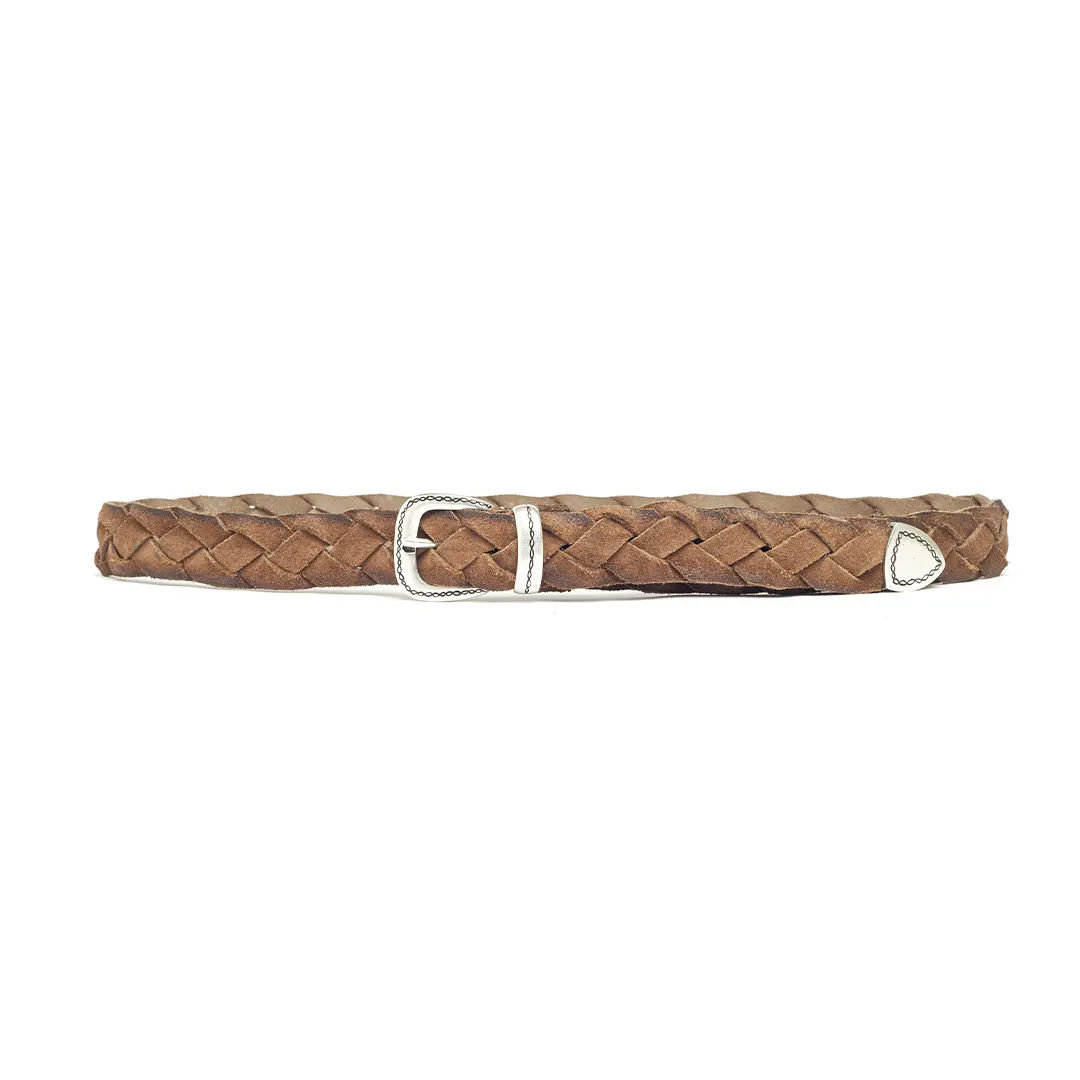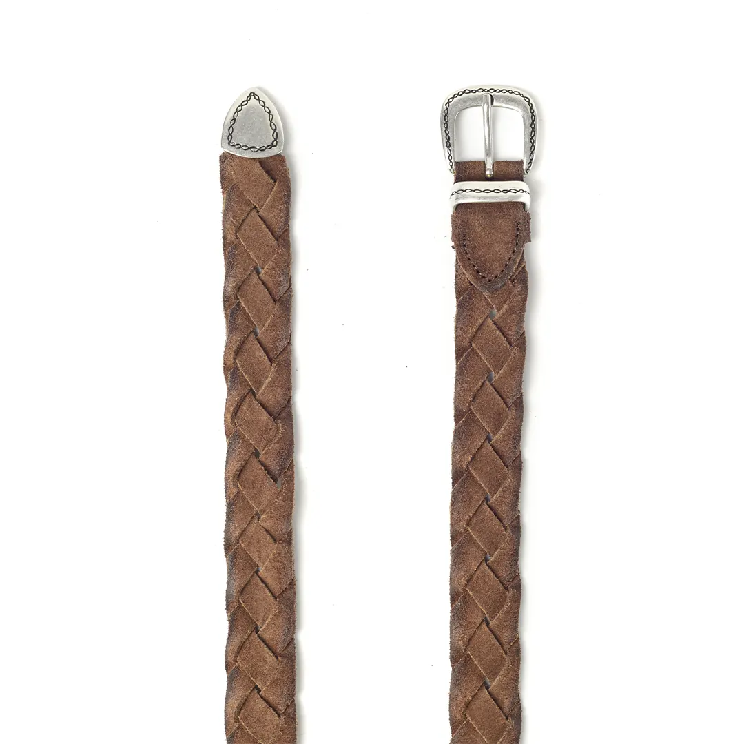 Cintura a treccia in pelle suede vintage 100%, intrecciata a mano. Altezza cm 3 con fibra e passante in metallo inciso in finitura argentata.