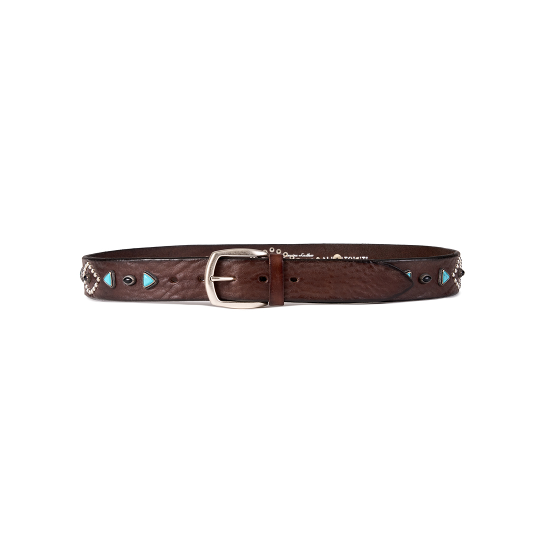 Cintura alta cm 3,5, in vera pelle bovina 100% tinto in capo. Lavorazione multiple di borchie e con fibbia in finitura argento.